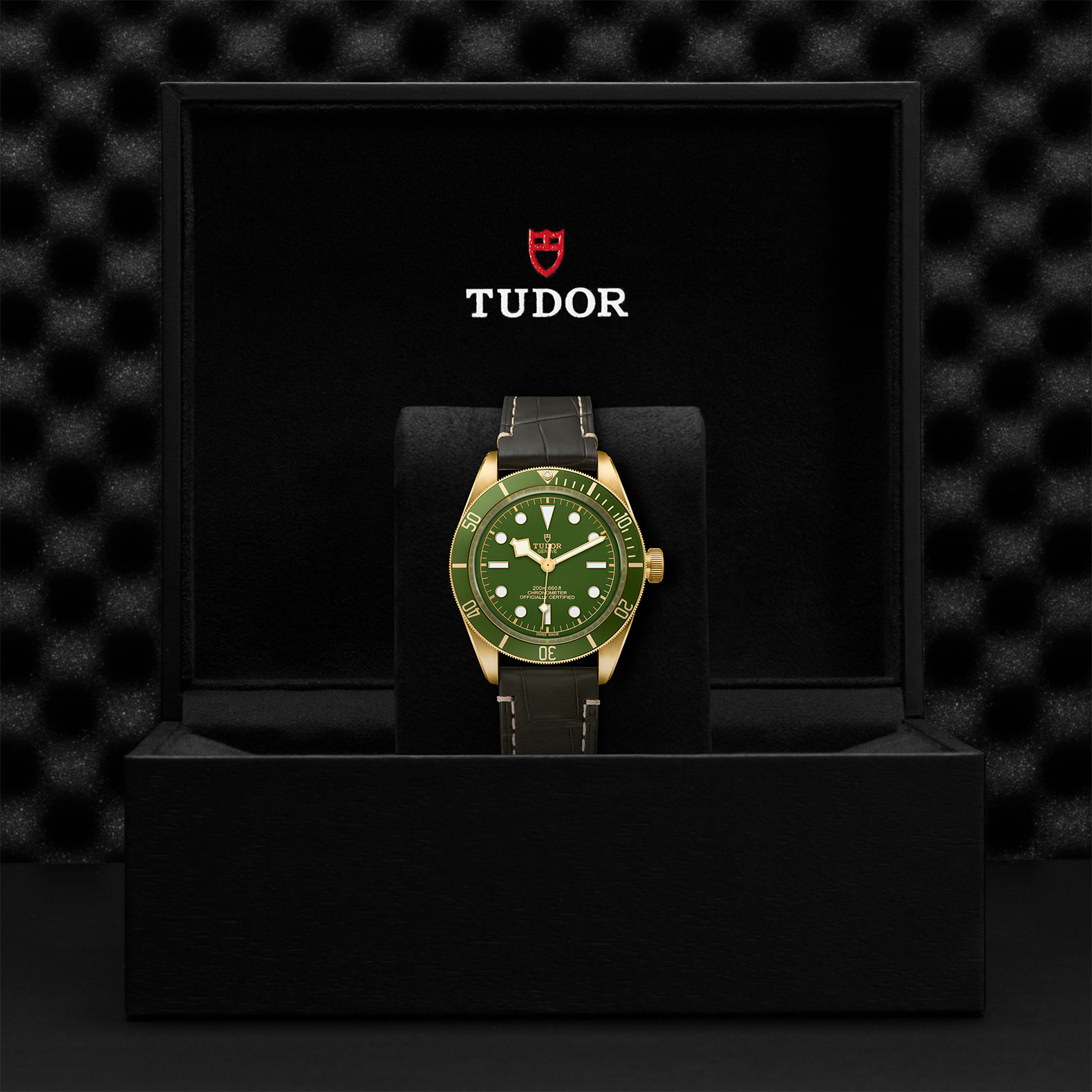 Στεφάνη : Περιστρεφόμενη στεφάνη μονής κατεύθυνσης από κίτρινο χρυσό 18Κ, διαβαθμισμένη στα 60 λεπτά, με ματ πράσινο δίσκο από ανοδιωμένο αλουμίνιο και επιχρυσωμένους χρυσούς δείκτες και αριθμητικά στοιχεία