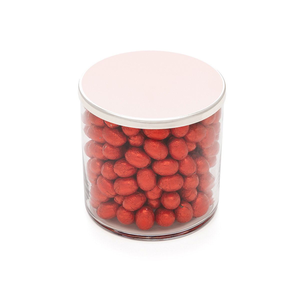 Γυάλα με επάργυρο τυπωμένο καπάκι ροζ παστέλ γεμάτη με σοκολατάκια.