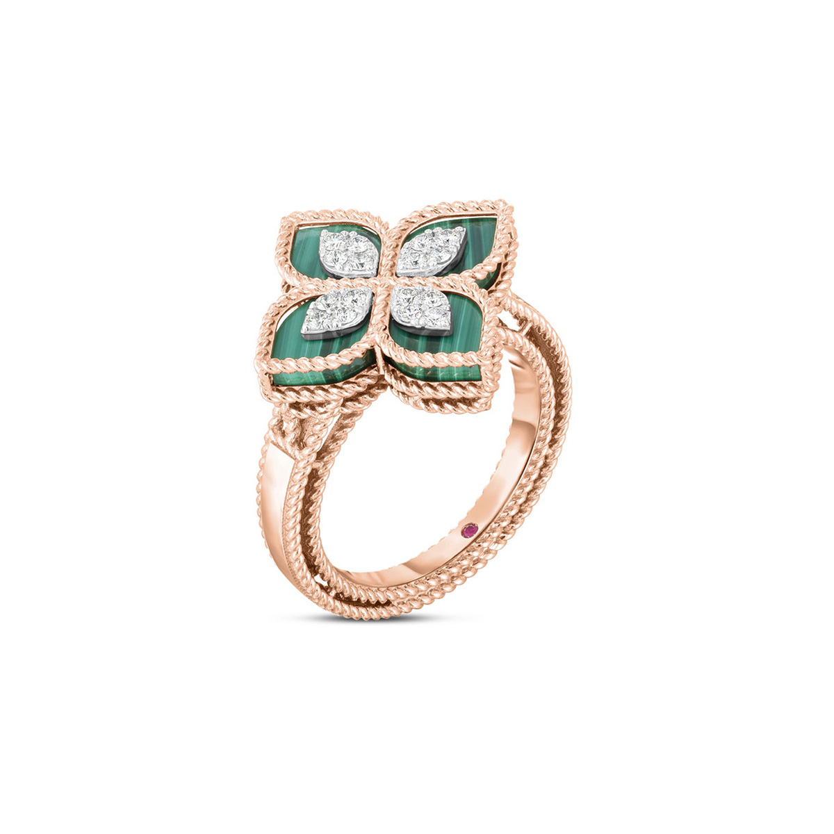 Rose Gold Ring with Diamonds,Malachite and Ruby